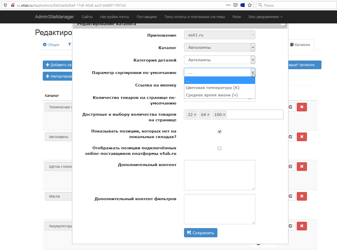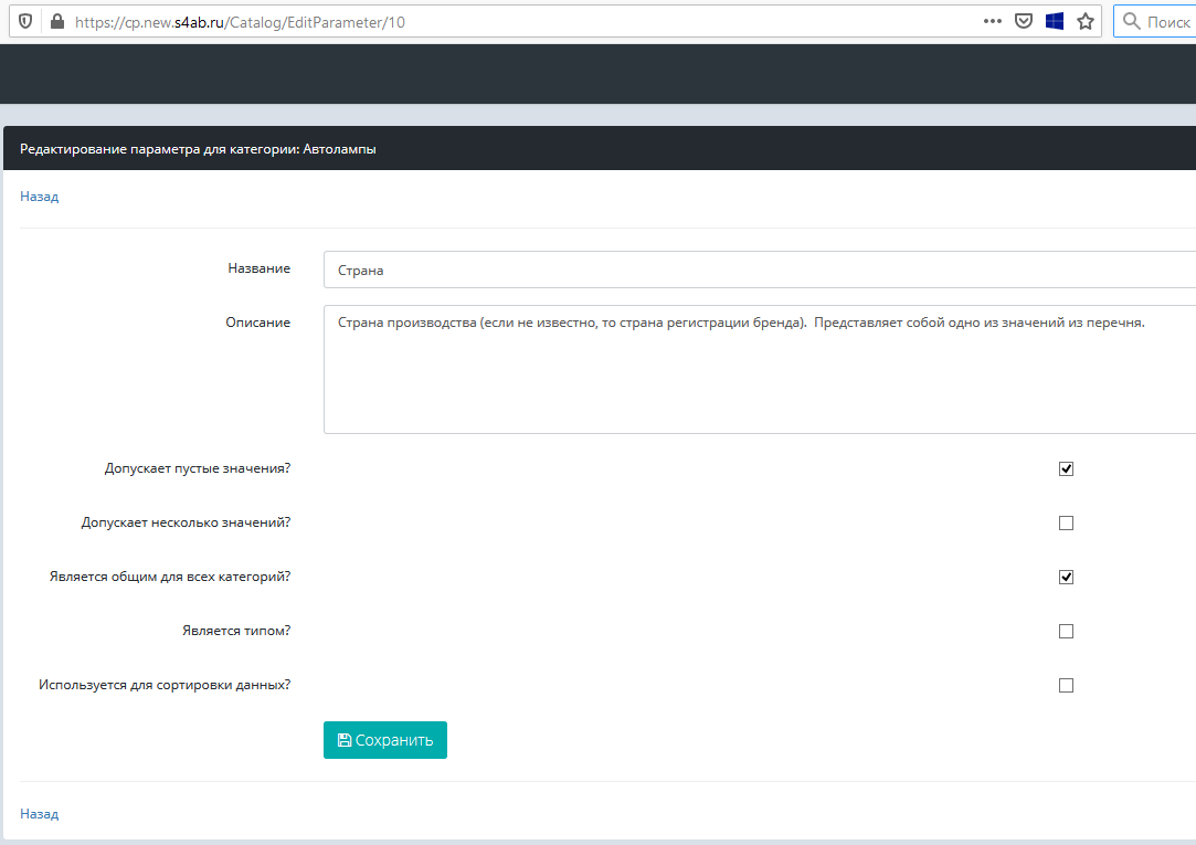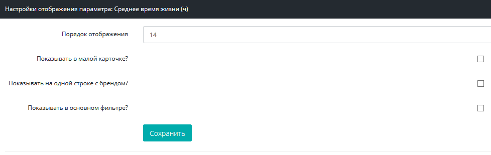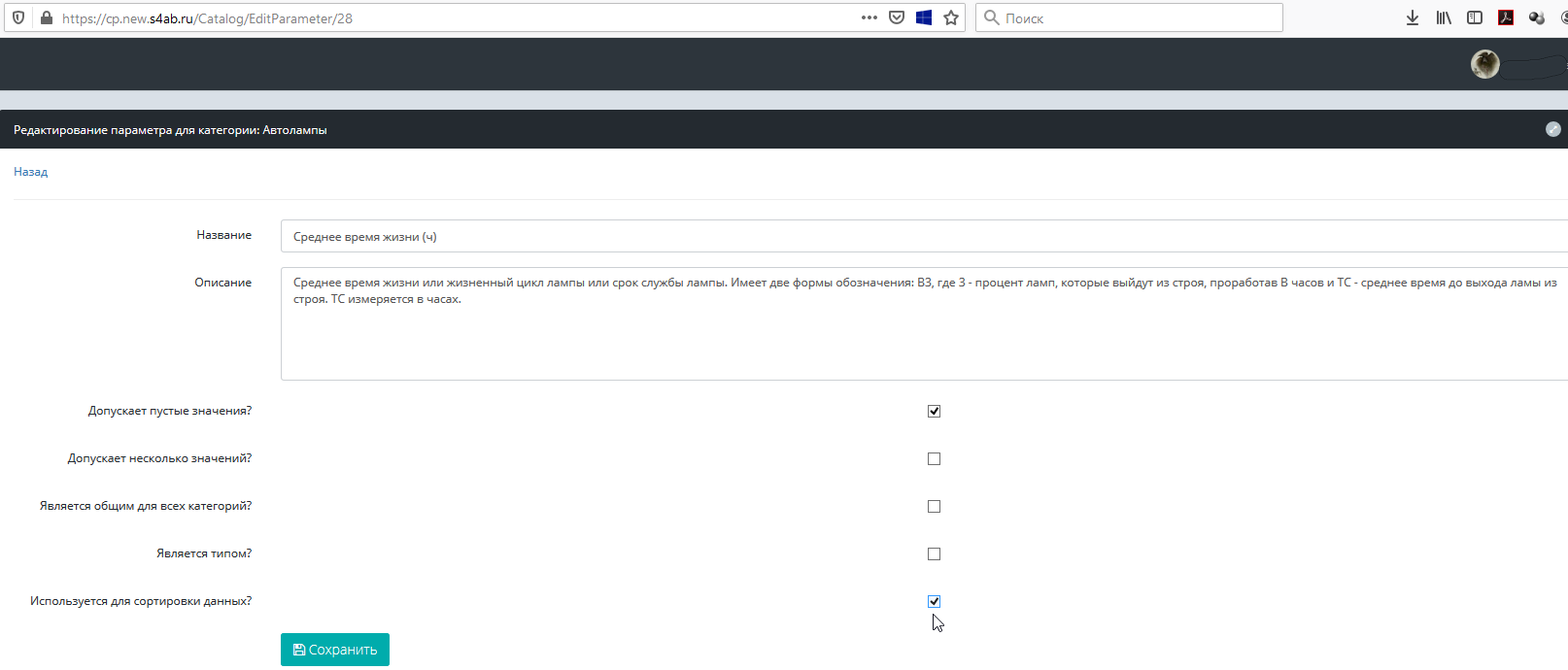 Последний флажок определяет, может ли вестись сортировка по данному параметру в результатах выдачи на сайте. Например, в каталоге побора автомобильных ламп указана возможность сортировки выдачи по параметру “Среднее время жизни (ч)”, задаваемому в часах.