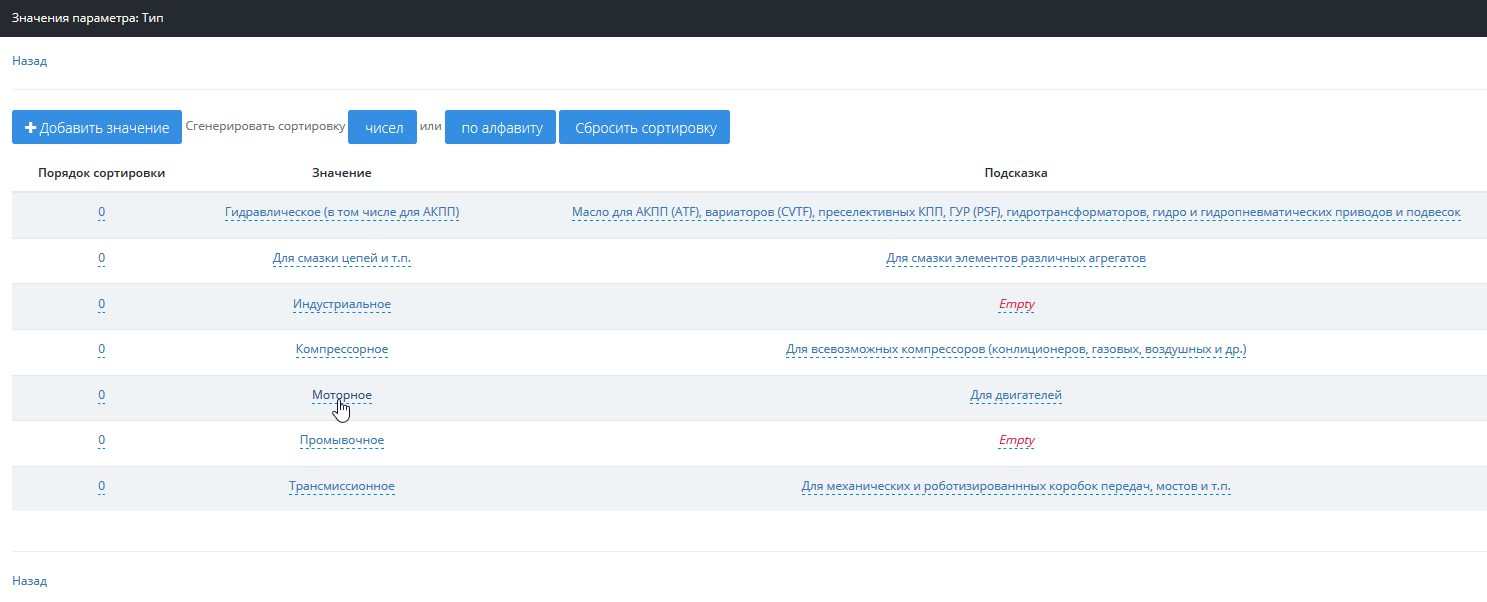 Флаг “Порядок отображения” определяет порядок следования параметров в фильтрах и самих карточках товаров. Флаг “Показывать в малой карточке” делит параметры по группам отображения “Основные параметры” и “Дополнительные параметры”. Флаг “Показывать на одной строке с брендом” определяет, участвует ли данный параметр в генерации названия карточки товара или нет. Как правило это параметр “серия” продукта. Но можно указывать и другие параметры в любом количестве, если они имеет смысл для наименования. Например, в маслах принято указывать ещё и вязкость: