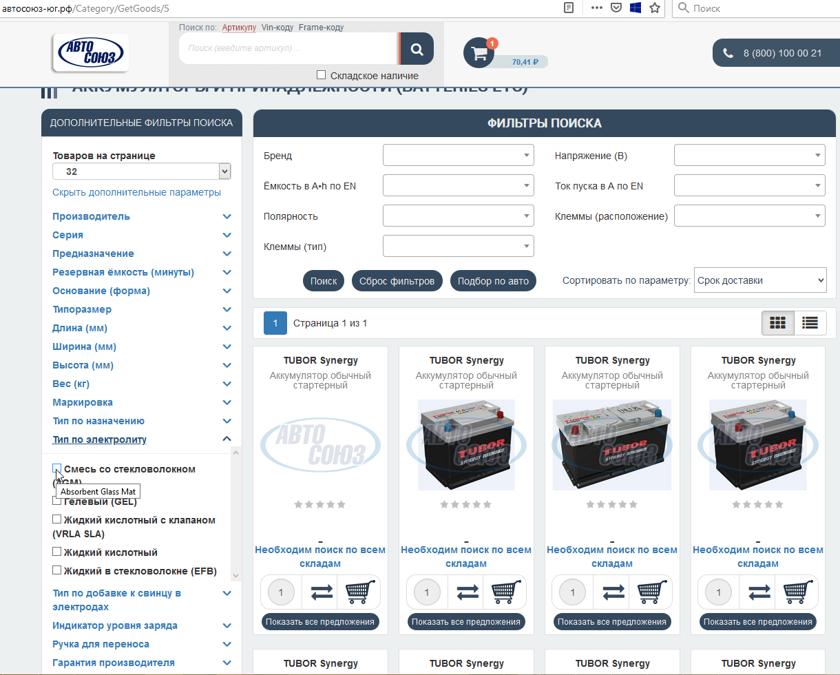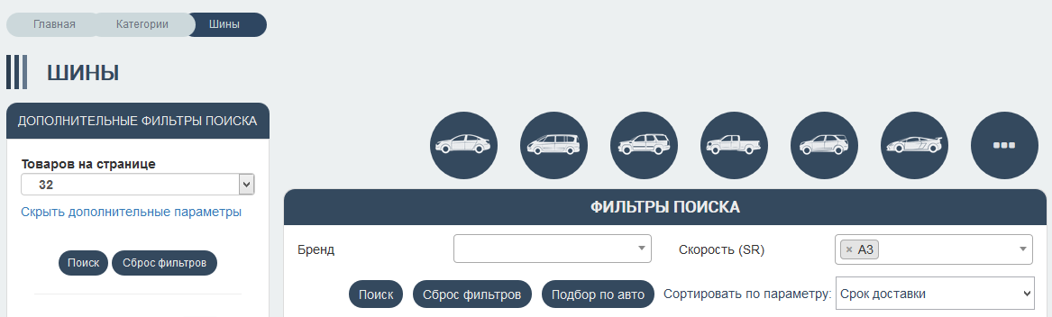 и нажать на кнопку “поиск” внизу соответствующего блока фильтров, то все фильтры и дополнительные и основные будут ограничены значениями, которые имеются у AGM-аккумуляторов. Если у какого-то параметра вообще не будет таких значений, то он исчезнет из списка параметров, пока вы не нажмёте на кнопку “Сброс фильтров”. Вот, к примеру, в каталоге шин нет на данный момент вообще ни одной шины с рейтингом скорости (SR), равным A3, что можно увидеть исчезновением всех остальных фильтров (кроме бренда, который всегда остаётся, но в данном случае не будет содержать значений) при выборе оного: