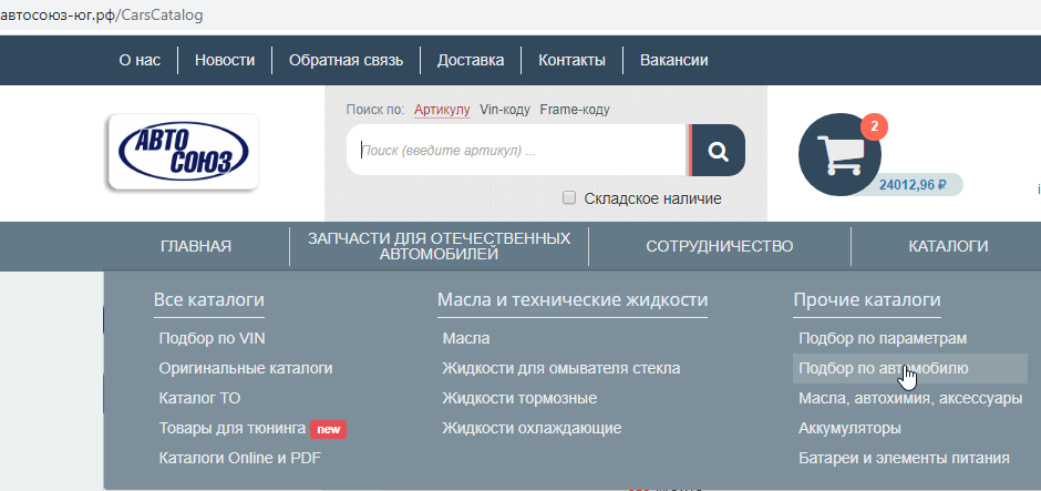 Параметры товаров в каталоге нужны для того, чтобы можно было настроить соответствующие фильтры на сайте, и сузить выдачу результатов поиска, получив только те позиции, которые вам нужны. Эту фильтрацию можно осуществить вручную, выбрав необходимые фильтры в главной (горизонтальной части) и дополнив их при необходимости фильтрами из левой вертикальной вкладки. Можно осуществить это и автоматически, нажав на кнопку “Подбор по авто” или выбрав из меню “Каталоги” главного меню подменю “Побор по автомобилю”. Найдя необходимую вам модификацию автомобиля и указав затем категорию каталога, по которому нужно осуществить поиск, вы фактически передаёте автоматически соответствующему каталогу подбора по параметрам необходимые значения фильтров.