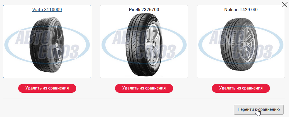 Быстрая оценка количества полученных результатов такова — около 250 вариантов шин только на имеющихся в локальной базе складах. Ещё приличное количество — на online-складах. Чтобы сделать чёткий и ясный выбор применяем процедуру сравнения товаров, для чего в карточке каждой из заинтересовавших нас шин жмём среднюю кнопку: