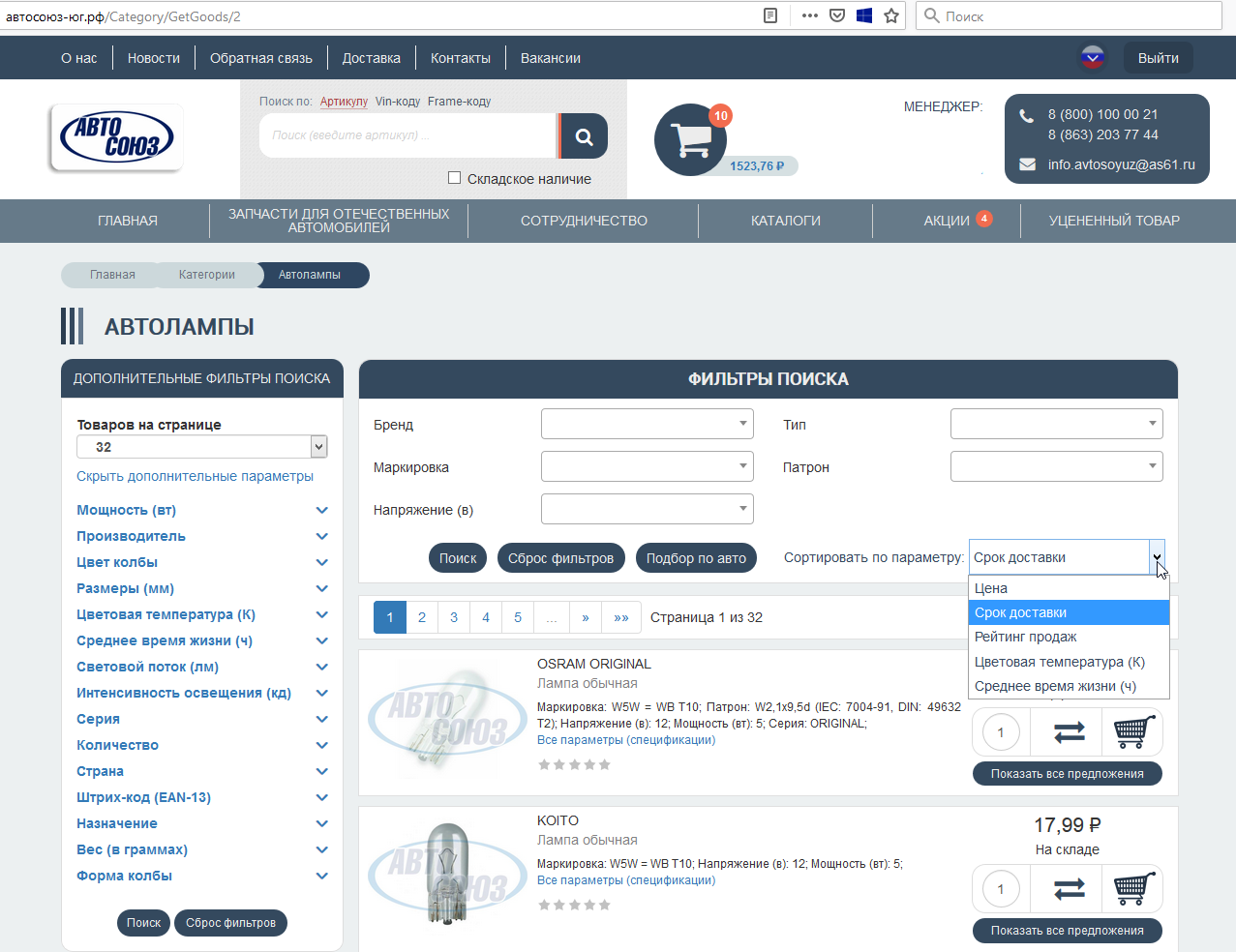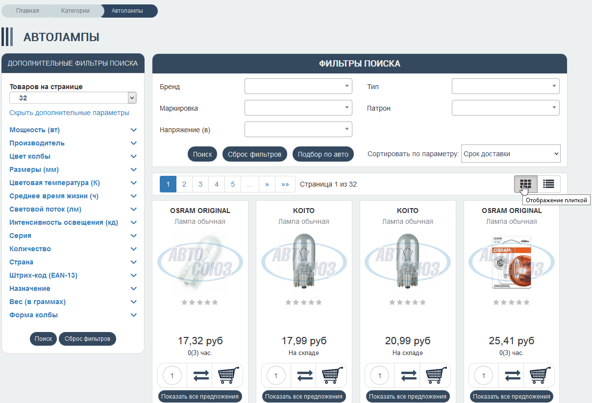 В данном случае, как видите, она не установлена и сортировка ведётся по сроку доставки, которая задана по умолчанию для всей системы. Отметим сразу, что как можно видеть на вышеприведённом снимке с экрана, супер-администратор системы может настроить для вас список доступных к выбору вариантов вывода количества карточек на одну страницу (в данном случае 32, 64 или 100), а также установить выбор этого количества по умолчанию. Также можно позволить (или запретить, как тут) отображать в выдаче позиции на складах других порталов самой системы S4AB, подключенных в качестве online-поставщиков.
