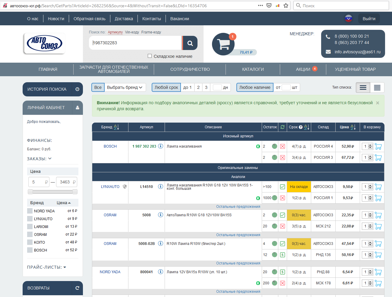 мы получаем минимальную цену на лампу BOSCH Longlife Daytime в 52 рубля 90 копеек со сроком доставки от 4 до 7 рабочих дней на складе РОССИЯ-4 интернет-магазина автосоюз-юг.рф: