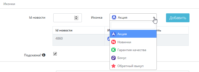 Обратите внимание на то, что номер (id) новости, которая соответствует данной акции, как раз 4860, что можно было увидеть в адресной строке на восьмом снимке с экрана, представленном на данной странице документации. Итак, давайте пройдёмся по всем параметрам настройки механизма “АКЦИИ” и определим, что позволяется делать:
