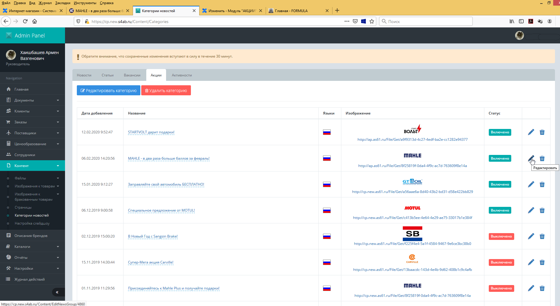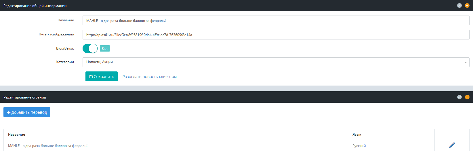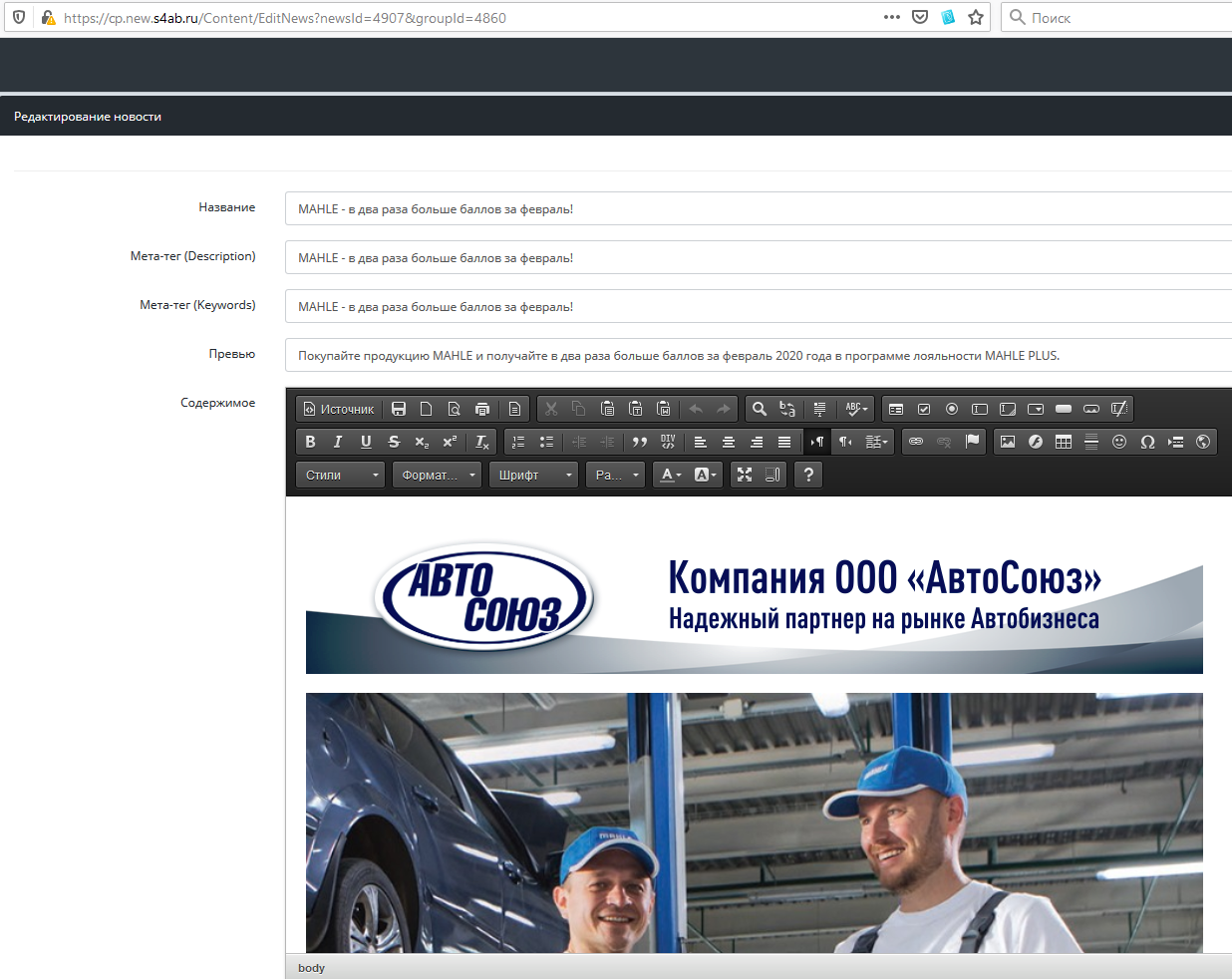 Здесь, как видите, можно включать или выключать отображение акции, менять её название и изображение для кнопки перехода, в данном случае логотип бренда MAHLE. Кроме того, можно выбрать список категорий модуля новостей, в которых будет отображаться соответствующая информация. Можно также разослать данную новость клиентам. Что касается редактирования текста самой акции, то делается это с помощью стандартного механизма редактирования новостей и статей системы S4AB. В данном случае для этого нужно нажать на кнопку “Карандаш”, что справа внизу на предыдущем снимке с экрана и получить следующее окно: