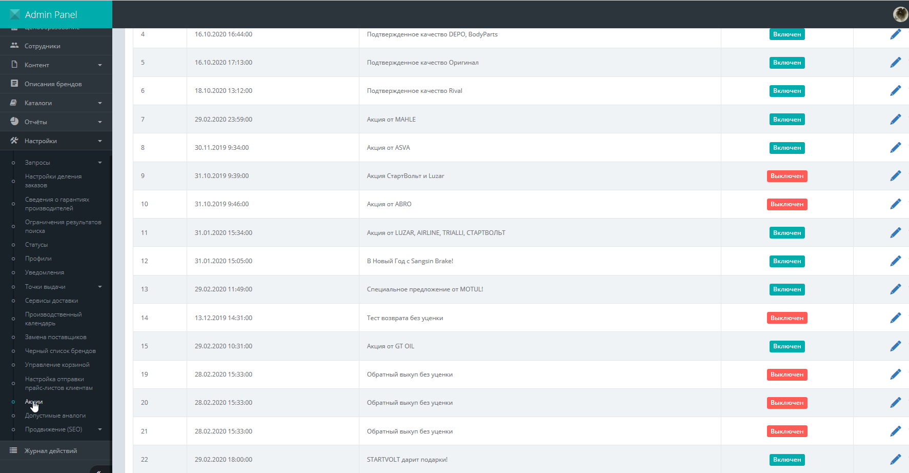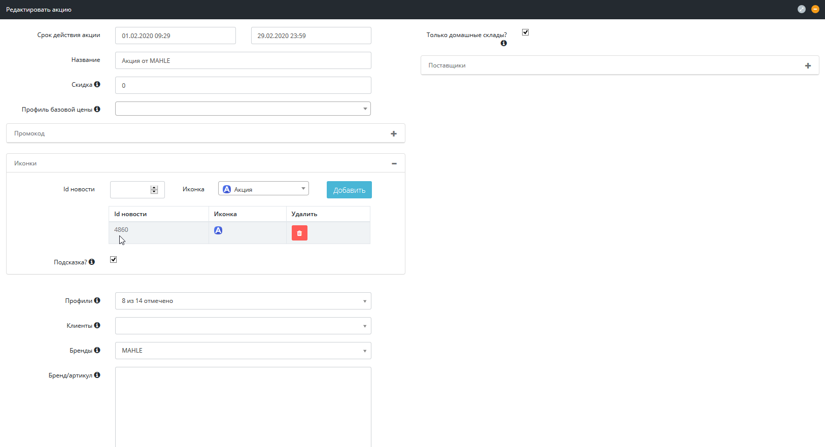 В этом перечне акций за номером 7 как раз акция бренда MAHLE. Она не настроена, так как это дистрибьюторская акция, но мы можем увидеть весь перечень возможностей по настройке механизма, нажав на карандаш для её редактирования: