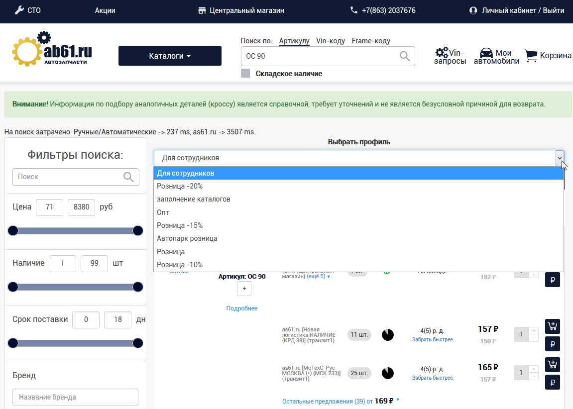 Но в системе есть некоторое количество модулей, которые доступны только пользователям, имеющим соответствующие права (роли). Например, у сотрудников интернет-магазина с соответствующими правами есть возможность сразу при поиске увидеть цену товара для клиента с определённым профилем: