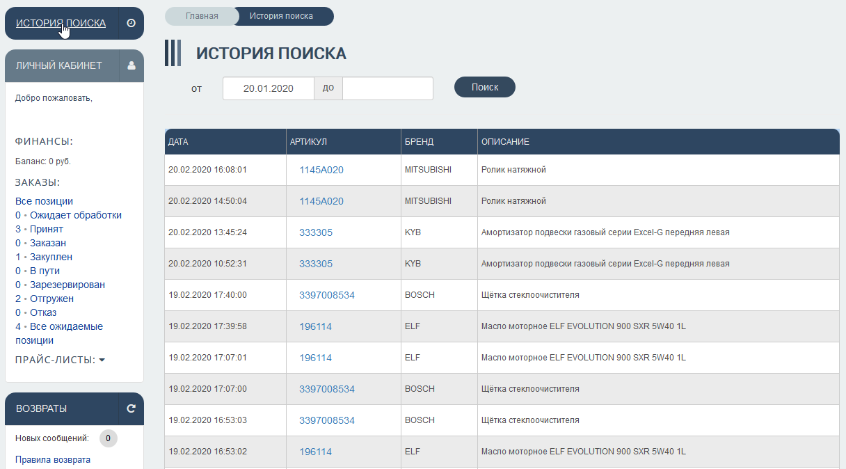 Также не забудем упомянуть об очень удобной функции, позволяющей просмотреть историю поиска. Если пользователь забыл артикул детали, которую искал, то этот инструмент не имеет цены для решения этой проблемы: