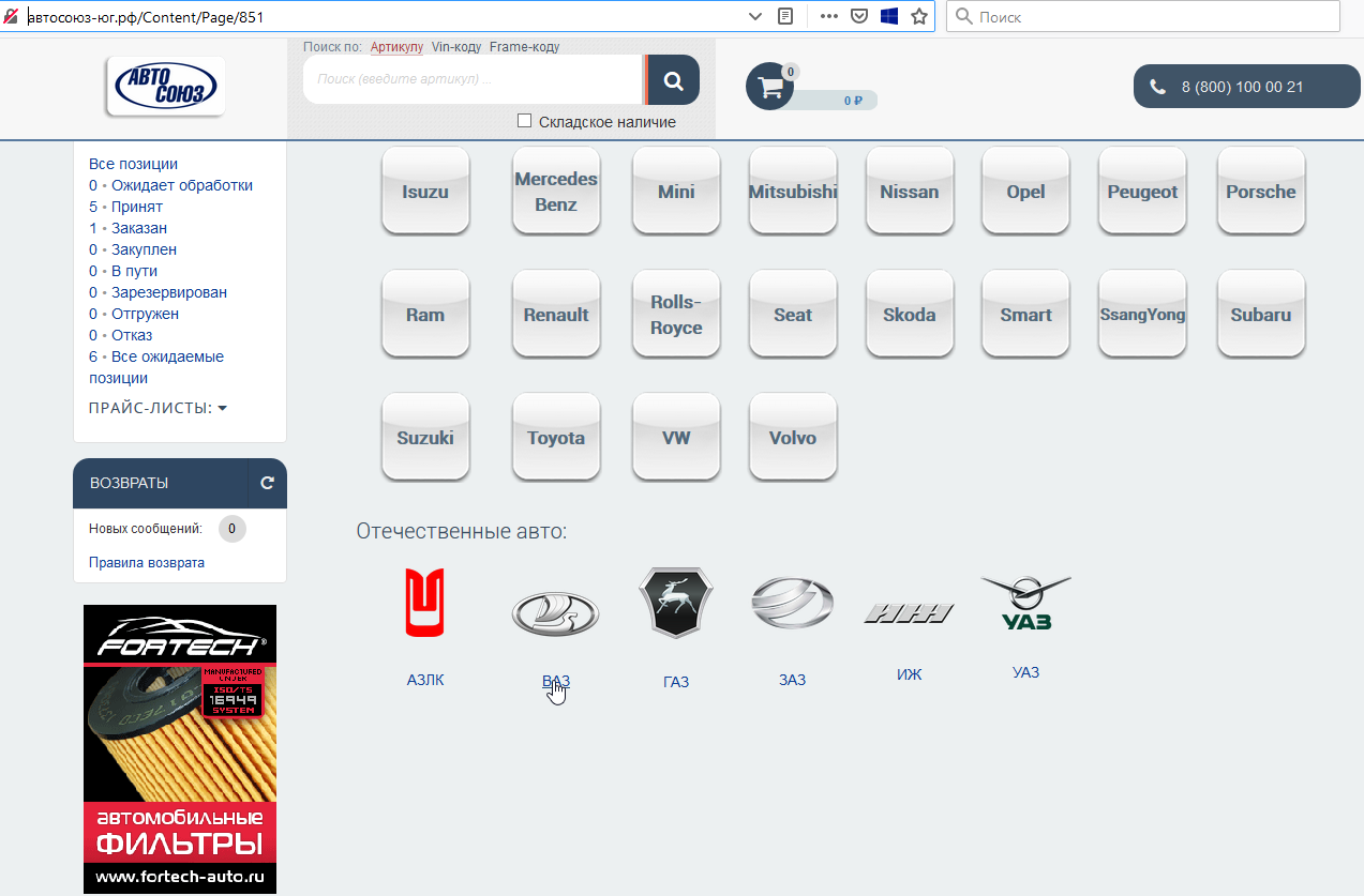 Следующая вкладка в личном кабинете “Загрузить в корзину” фактически нами уже обсуждалась при описании модуля “Работа с корзиной”. Модуль “Возвраты” описан на отдельной странице.