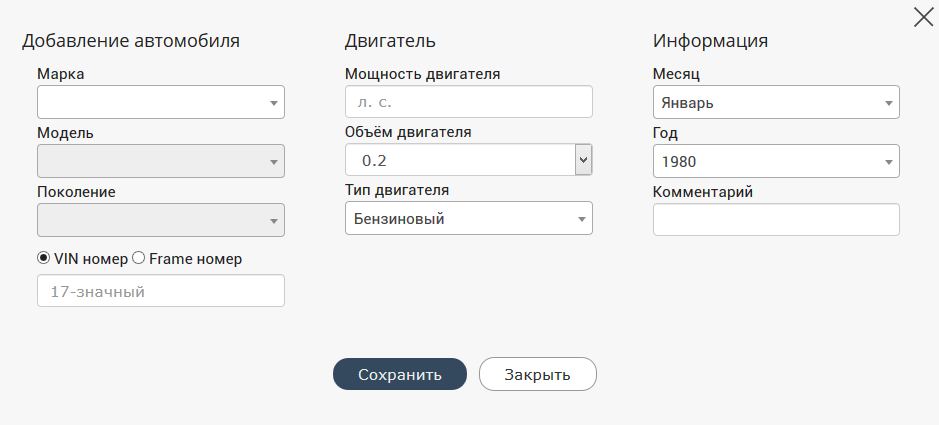 где все поля, кроме “Мощность двигателя” и “Комментарий”, являются селективными. Мощность задаётся цифрами в лошадиных силах, комментарий — произвольная строка. Название модификации в полученном списке генерируется автоматически на основе конкатенации (слияния) значений трёх первых параметров: “Марка Модель Поколение”.