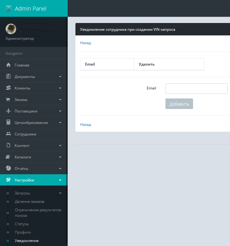 Далее нужно заполнить первые три поля, при необходимости ввести комментарий и нажать ещё раз кнопку “Добавить деталь” для следующей запасной части, которую вам нужно приобрести. В поле наименование детали нужно указать на самом деле только категорию, например “масло моторное” или “амортизатор передний”. Когда будут добавлены все необходимые товары, следует нажать кнопку “Создать VIN-Запрос”. Результатом этого будет отправка уведомления менеджеру интернет-магазина на электронную почту, определяемую в следующем меню ПУПа :