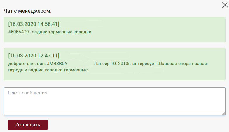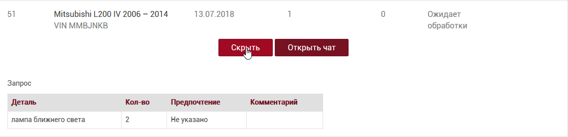В списке в личном кабинете есть ещё одна кнопка “Открыть чат”. Она предназначена для того, чтобы организовать переписку в формате, отличном от стандартно предоставляемой возможности VIN-запроса. Это дополнительный механизм offline-беседы с менеджером, то есть как бы обсуждения и уточнения запроса. В ПУПе результат такой беседы выглядит так: