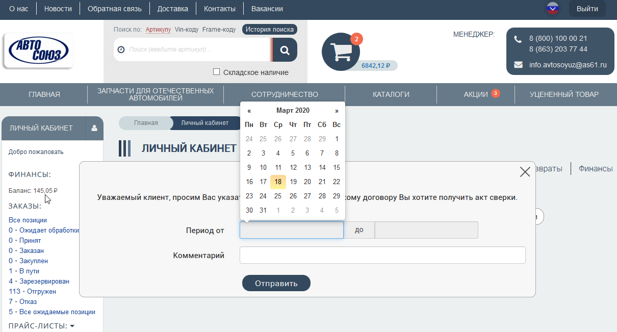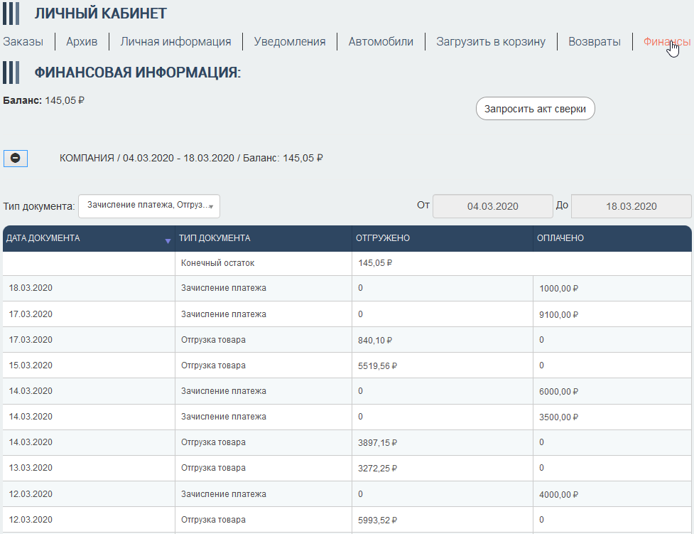 Информация получается путём запроса и выгрузки её с учётной системы интернет-магазина. Также по отдельной кнопке можно запросить акт сверки за определённый период: