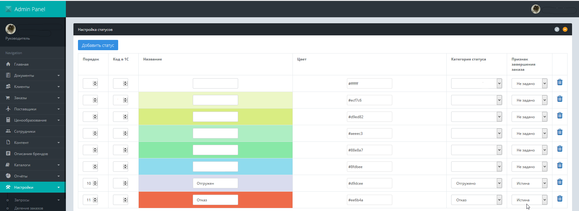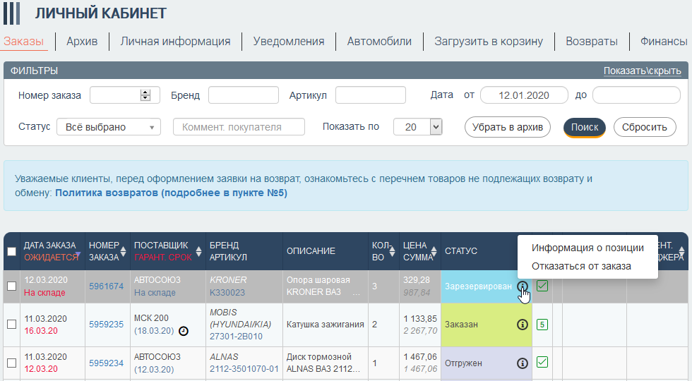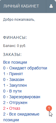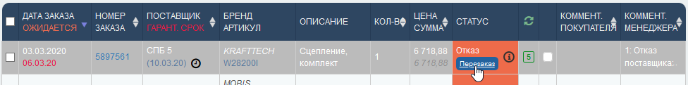 Статус отказ всегда автоматически снабжается системой кнопкой “Перезаказ” с целью осуществления быстрого повторного заказа этого же товара при необходимости.