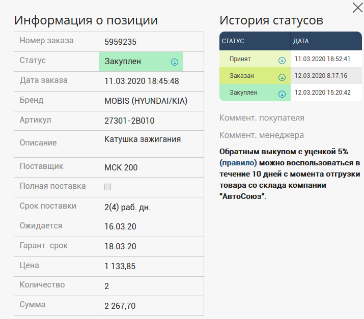 При этом список статусов в истории будет отличаться в зависимости от того, с домашнего склада или транзитного был осуществлён заказ. Важным моментом является автоматически вставляемый комментарий менеджера касательно обратного выкупа. Если при нажатии на эту кнопку помимо фразы “Информация о позиции” появляется и другая фраза, то курсор мыши нужно направить именно на ту фразу, которая вам нужна: “Отказаться от заказа” или “Создать возврат”. Первое возможно только до момента присвоения статуса “Отгружен”. При наступлении статуса отгружен возможен только возврат по условиям, описанным в следующей колонке ““Возможность обратного выкупа”. Если была нажата кнопка “Отказаться от заказа”, то в последнем столбце автоматически появляется комментарий менеджера “Отказ от заказа на рассмотрении”. Как только менеджер подтвердит отказ, то комментарий изменится на “Отказ клиента”, а сам заказ получит статус “Отказ”. Если причина отказа другая, то и комментарий будет другой, например, как на следующем снимке с экрана: