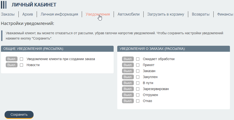 Так, обычно оставляют только уведомления “Отказ” и “Отгружен”, а остальные отслеживают в личном кабинете.