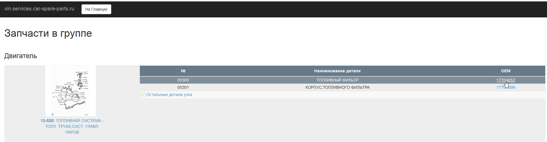 Здесь нужно выбрать необходимый вам узел, например, “топливная система-фильтр топливный” и нажать на OEM-номер детали, как показано на следующем снимке с экрана: